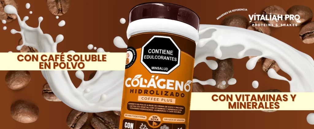 Además, contiene proteína de arveja y contiene aminoácidos de cadena ramificada (BCAAS), Café soluble en polvo, adicionado con una mezcla de vitaminas y minerales.